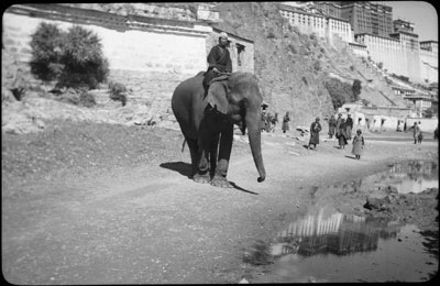 (The 13th Dalai Lama’s elephant, on the path on the south-side of the Potala Palace, 1936, photograph by Evan Yorke Nepean. Nepean was a wireless-communications expert who was part of a 1936 British Political Mission and radio programme to Tibet, supported by the Tibetan government at the time. See more in Nepean’s obituary here)