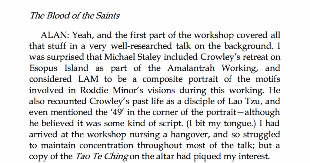 Occultists Alan Chapman and Duncan Barford are prominent proponents of this interpretation. In their 2009 book Blood of the Saints, they make much of this point. Chapman seems positively convinced that identifying these glyphs as the number 49 is the key to solving everything about the portrait and its true meaning to Crowley. In brief, Chapman and Barford, elaborating on Staley’s own comments, argue that the LAM portrait is best understood as a representation of the Daoist master Lao Tzu, who Crowley communed with following the Alamantrah Working, during a solitary retreat he undertook on Esopus Island in the Hudson River. Here is an excerpt of a dialogue between Chapman and Barford shared in their 2009 book, where the two magicians discuss attending a workshop on LAM-related practices with Staley in 2007. Chapman’s aside, ‘I bit my tongue’, conveys the extent to which he felt or feels that identifying the glyphs in Crowley’s drawing as Tibetan or any other type of letters is incorrect: