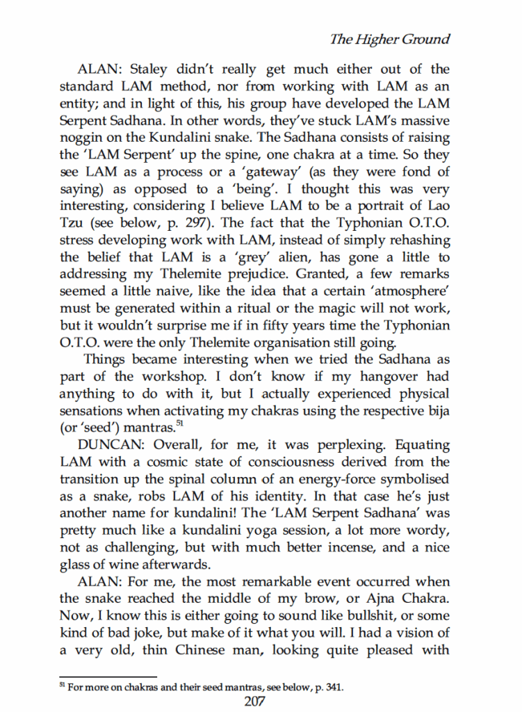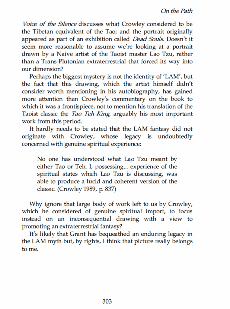 The conversation goes on, and the longtime friends and magical collaborators share more about their own experiences with and theories about LAM. Later in the text, Chapman reprints an older essay (‘Chinese Whispers: The Origin of LAM’, originally published in the Fortean Times under the name ‘Who Let the Greys In?’) where he argues his case that LAM is not an extraterrestrial but is in fact a representation of Lao Tzu or a kind of synthesis of Crowley’s experiences during the Alamantrah Working which then led to his shattering mystical insights on Esopus Island as part of his work plumbing the mysteries of the Taoist/Daoist classic the Tao Te Ching/Dao De Jing. Crowley produced his own ‘translation’ of the text, despite not knowing how to read it in its original language, claiming that his direct mystical experiences allowed him to articulate its deeper meaning better than any mere scholar of ancient Chinese could. In his Introduction to this new ‘translation’, Crowley specifically clarifies that the wizard he contacted during the Alamantrah seances assisted him to decode the Chinese text: