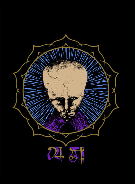 In a post on TOOL’s Facebook page from four years ago advertising the shirt’s reissue, we see the sort of almost willful indecisiveness around the Tibetan letters in the image that I’m talking about (with Crowley’s more inexpert approximation of Tibetan lettering in gold superimposed over a more correctly rendered purple digital lam ལམ་):