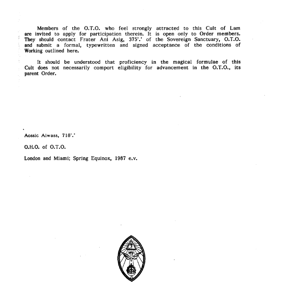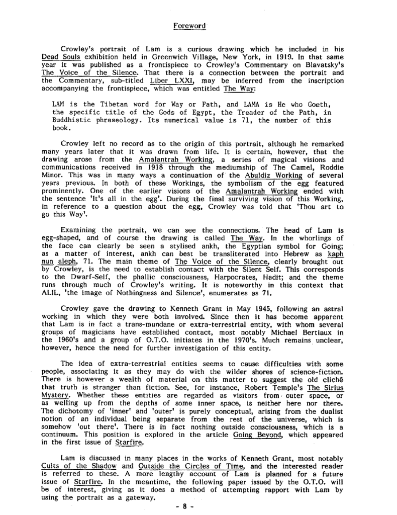 Kenneth Grant’s student Michael Staley, who wrote the foreword to the 1987 Lam Statement, explains there his and Grant’s belief that Crowley’s image was somehow connected to the wizard Amalantrah and his Working: