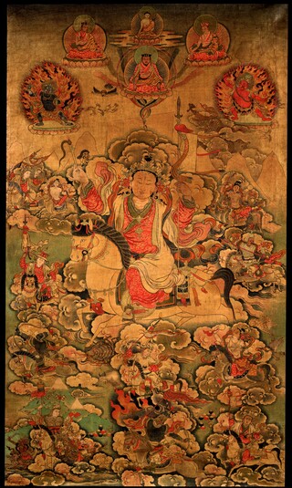 A 19th century Tibetan tangka or religious painting depicting Nyenchen Tanglha, an important Tibetan territorial protector deity associated with the sacred mountain range of the same name